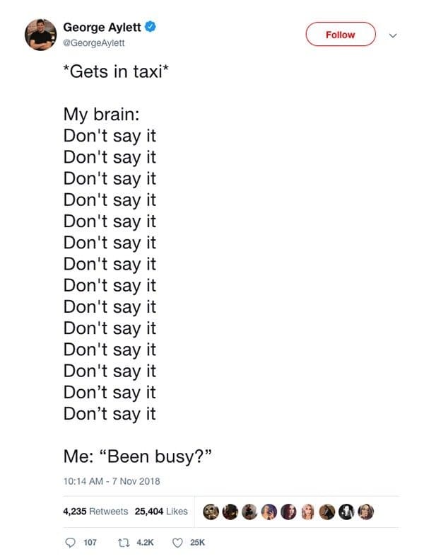 Then the viral tweets swing in with the real modern classics: the urge to ask a taxi driver if they’ve been “busy,” the group decision to solve one small problem with two hundred texts instead of one phone call, and the holy gratitude we owe to strangers who leave reviews so the rest of us can lurk in peace. I will not be perceived, but I will read twelve opinions about a sandwich.