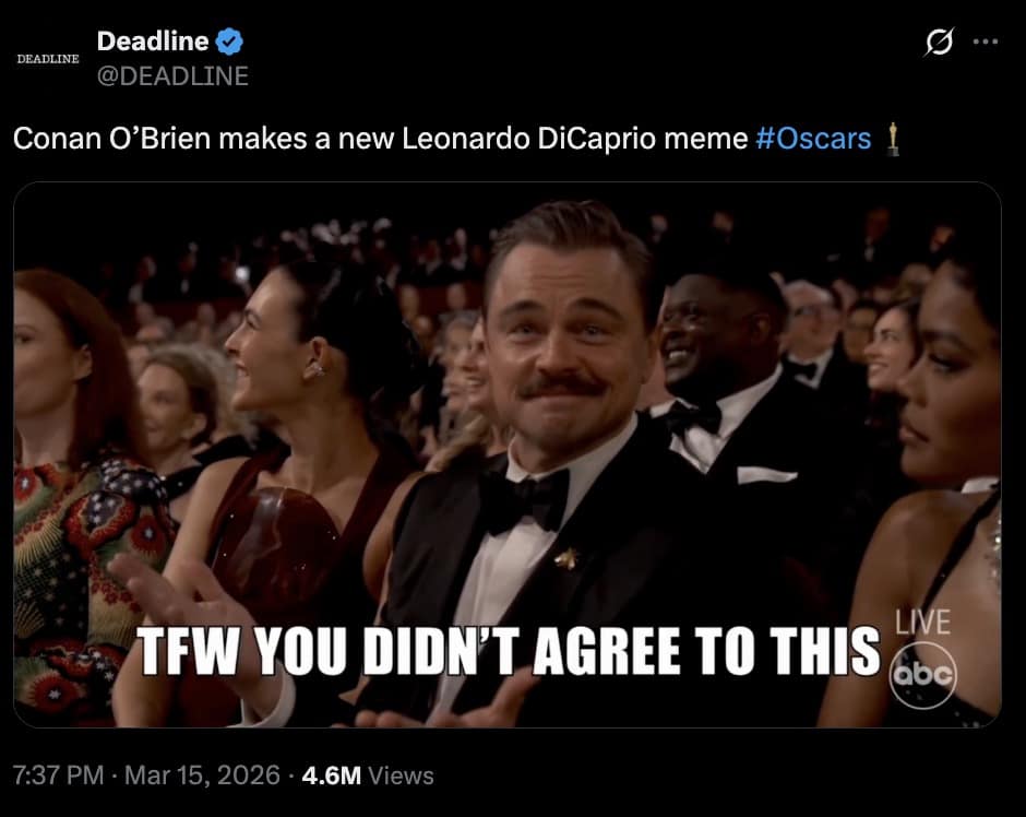 If you only saw the memes, you still got the plot: awards season finally ended, everyone got roasted, and Leonardo DiCaprio became a brand-new reaction image courtesy of Conan’s live setup.