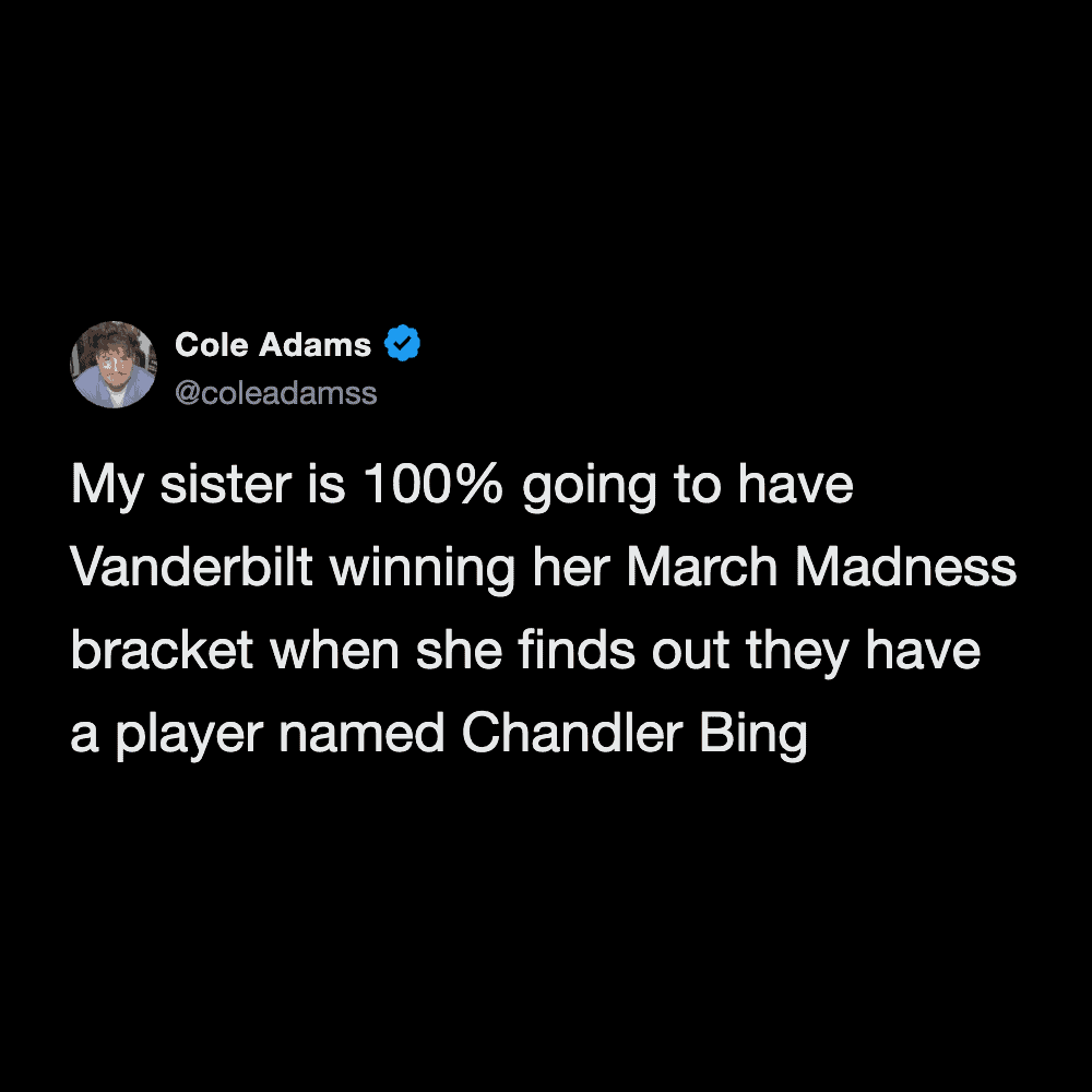 funny March Madness meme tweet anticipating the annual tradition of die-hard sports fans losing their office pools to people who picked teams based entirely on their mascots