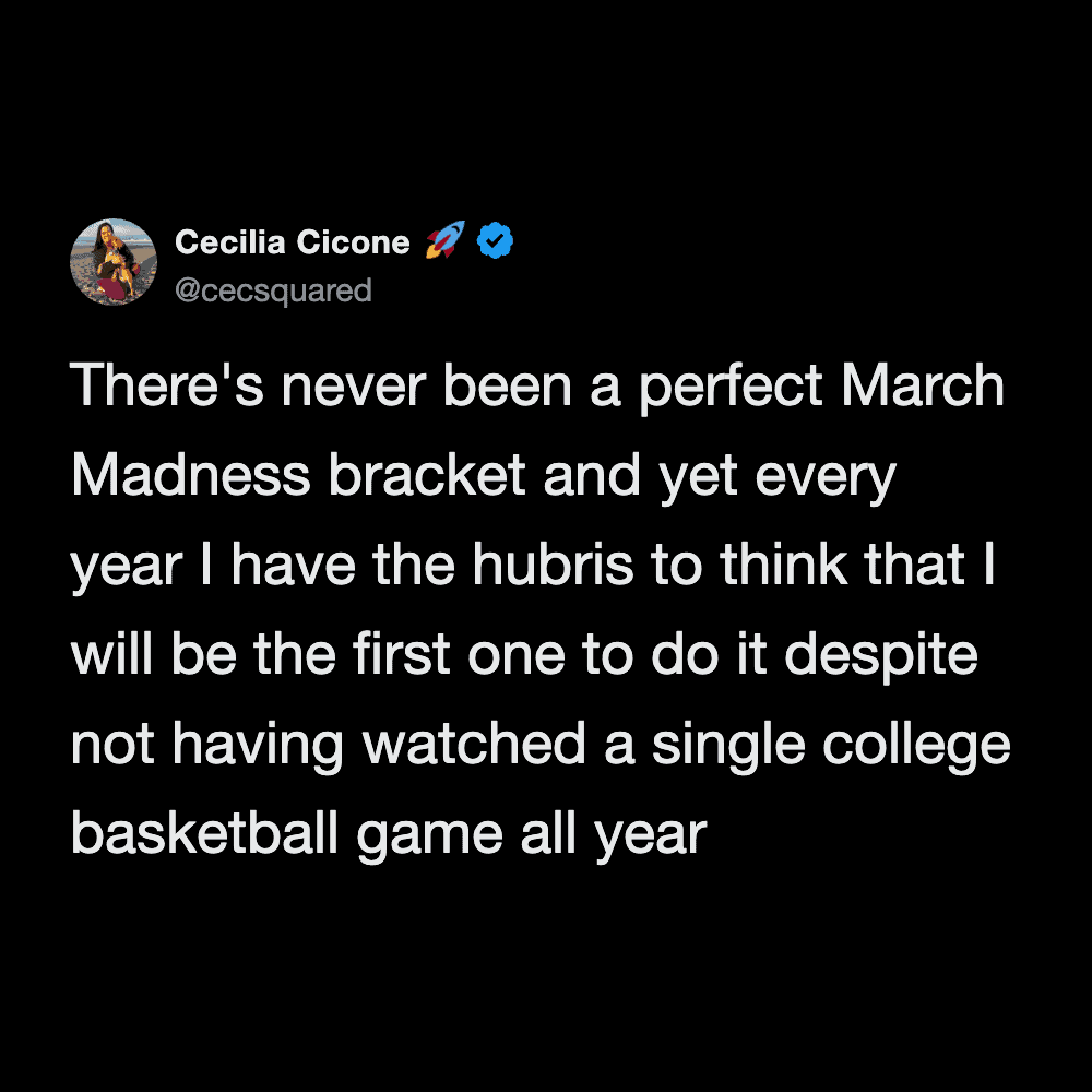 A witty March Madness meme tweet about the delusional optimism of fans who are already planning their billionaire lifestyles after being the "first person to ever have a perfect bracket."