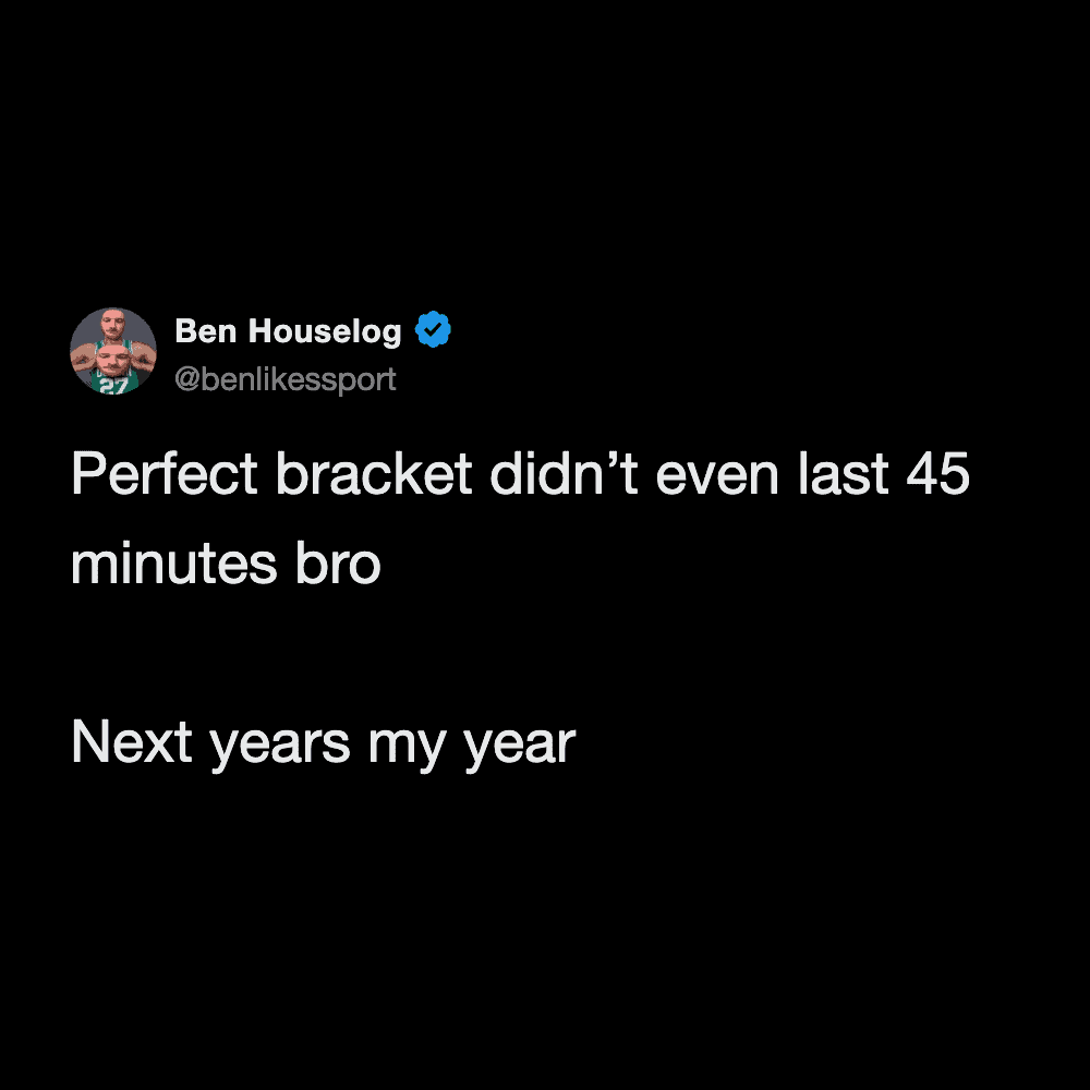 A quintessential march madness meme tweet that tracks the rapid cycle of grief: starting with the absolute confidence that this is the year for a perfect bracket, only to have it "busted" by the very first game.
