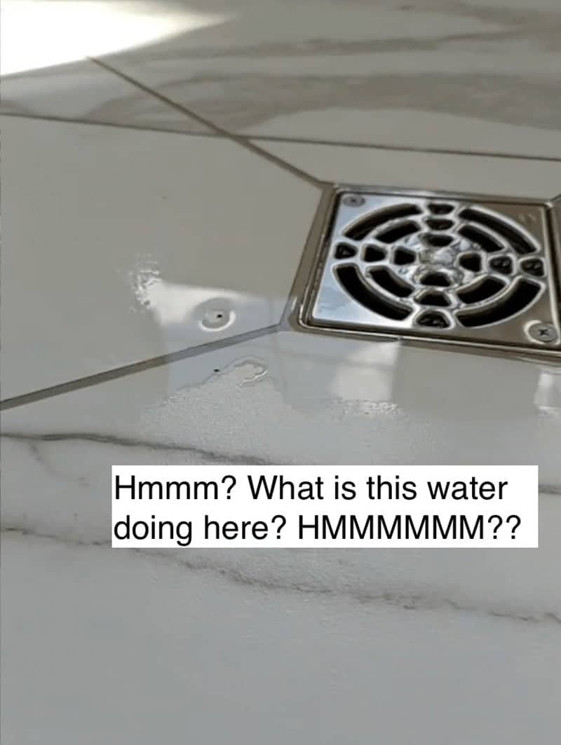 Hand shaking a loose black square shower head against a white marble tiled bathroom wall.