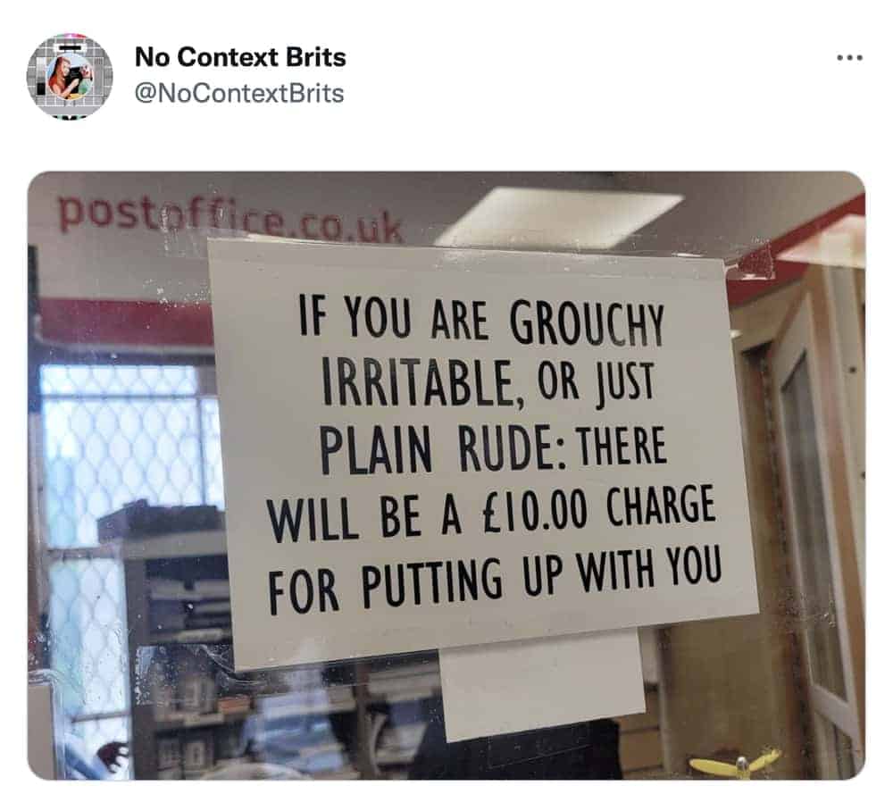 If this gallery has you immediately planning to study British signage in its natural habitat, dry humor memes are the obvious next chapter, covering the full spectrum of wit that communicates the most by appearing to say the least. Passive aggressive notes found in the wild belong right beside them, because the office kitchen and the British roadside operate on exactly the same frequency. And for anyone who wants to stay in the specifically British lane, British memes broadly are an extraordinarily rich ecosystem and you should absolutely spend time there.