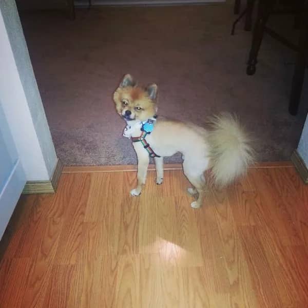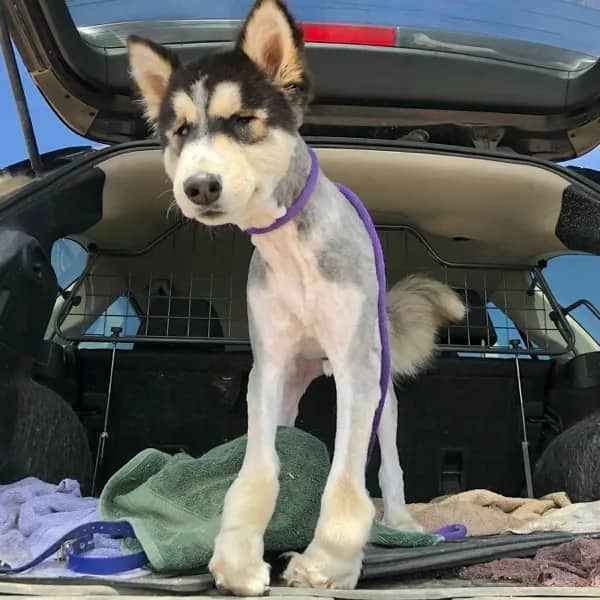 Black and white Husky mix with shaved body retaining fluffy head and pom-pom tail