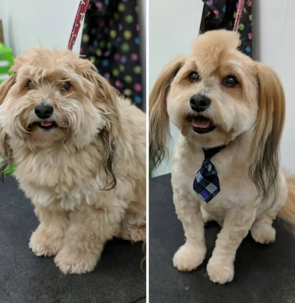 Pet grooming gone wrong covers a wide range, and the blue-eyebrowed terrier and the hot-pink poodle represent the creative end of that range. These are animals whose groomers had a vision that extended beyond the brief. The terrier arrived at the salon as a terrier and left as something that is auditioning for a band that has not been formed yet. The poodle is operating at a chromatic register that was not requested but has been accepted. Both animals are holding it together. Both animals deserve a moment of acknowledgment for their composure.