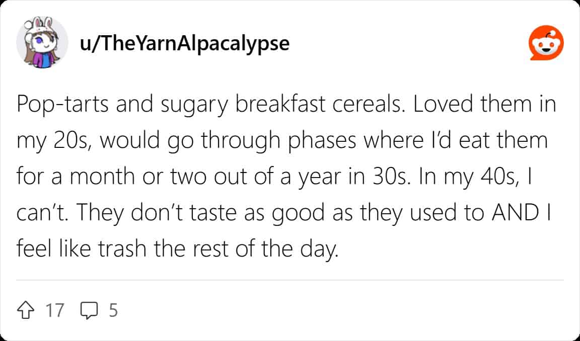 There is a very specific kind of loss that does not come with a sympathy card. Nobody sends flowers when your body quietly revises the terms of its agreement with cheese. There is no ceremony for the moment two beers becomes a biological event that lasts until Thursday. The r/Millennials thread that kicked off this gallery simply asked what foods people had to give up with age, and the resulting thread was thousands of comments long and read like a collective grief support meeting that was also, somehow, extremely funny. Foods millennials had to give up is not a health topic. It is a life stage. It is a generation arriving, more or less simultaneously, at the discovery that the body has opinions and those opinions are now being enforced.