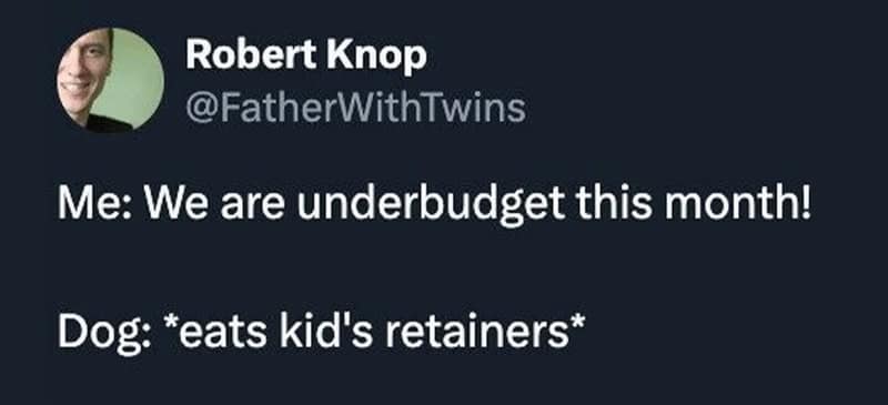 A relatable broke meme tweet by Mommy Owl (@Mommy__Owl) finding a silver lining in the high cost of kids: "Sure kids cost roughly $14,000 annually, but think about all the money you save from no longer having a social life."