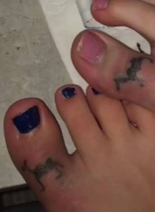 Close up of a big toe featuring a small monster face tattoo with fangs.