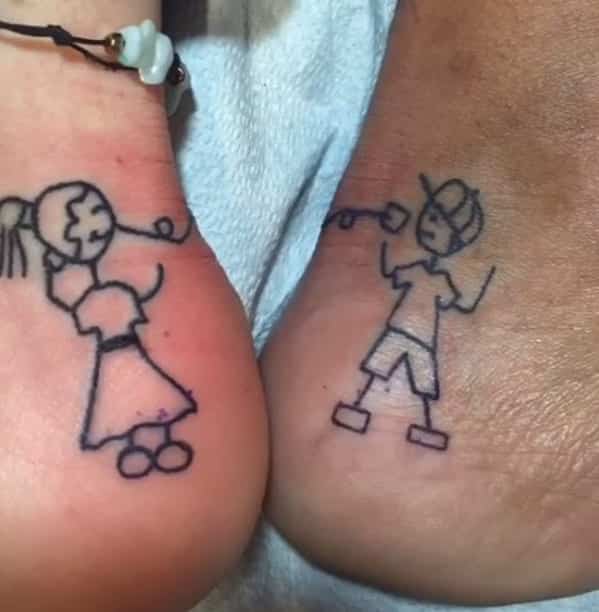 Collection of tiny stick figure tattoos including a small figure holding a knife.