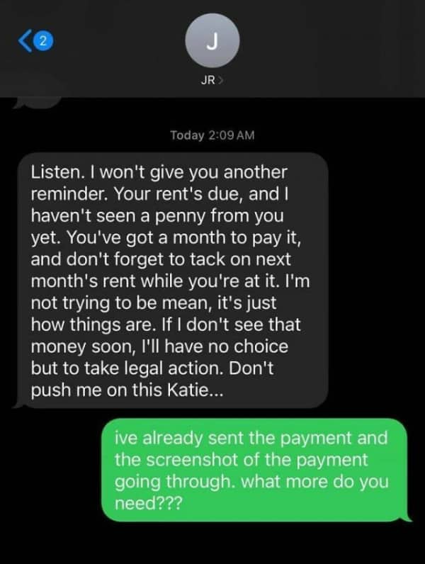 Text message thread where a landlord accuses a tenant of drinking beer because they pee at night.