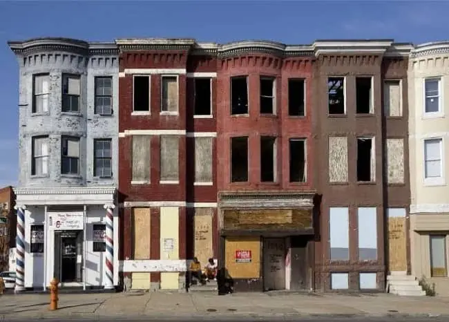 Bad city planning examples cluster in this gallery around the category of infrastructure that replaced the thing it was meant to serve. The downtown aerial with the convention center surrounded entirely by surface parking lots and elevated highway infrastructure is the clearest example: a building designed to bring people to a place, surrounded by a moat of car storage that ensures the place has nothing to offer anyone who arrives on foot. The street-level blight image is the longer-term outcome of the same decisions applied at the neighborhood scale. Chain-link fencing, orange construction barriers, and decaying rowhouses are the residue of a planning process that prioritized removal over replacement and left the gap in place for long enough that the gap became the neighborhood.