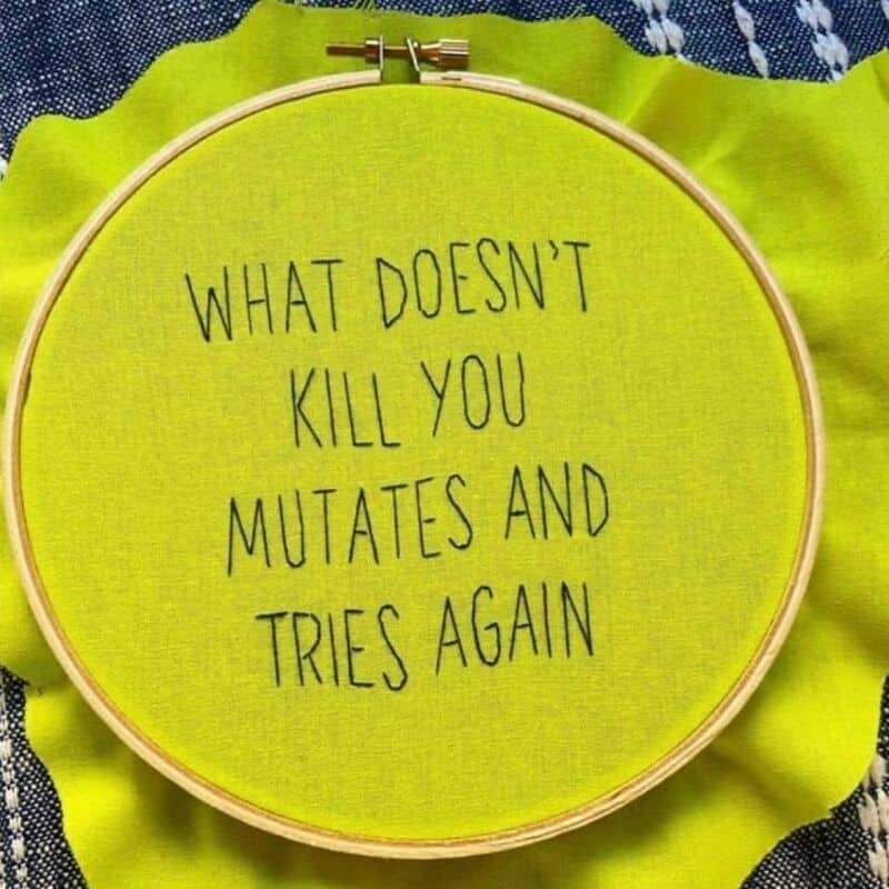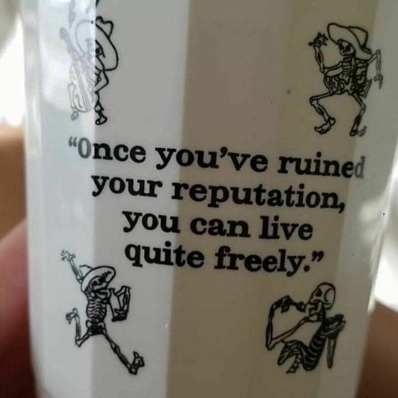 Funny life quotes in the dark wisdom category tend to arrive in formats that were not designed to carry them, and this gallery has several of the strongest current specimens. The cross-stitch reading about rib placement is a piece of needlework that required hours of patient, precise crafting to produce a sentence that is anatomically correct and occupies a register that cross-stitch has not traditionally been associated with. The dancing skeleton mug’s position on reputation ruin, that once ruined it enables considerably more freedom, is philosophy delivered at a retail price point that has since earned a place in a tradition predating the mug by several centuries. The mutation update to the classic “what doesn’t kill you” framework is the gallery’s most technically accurate entry, because the original formulation did not account for adaptation, and the corrected version does.