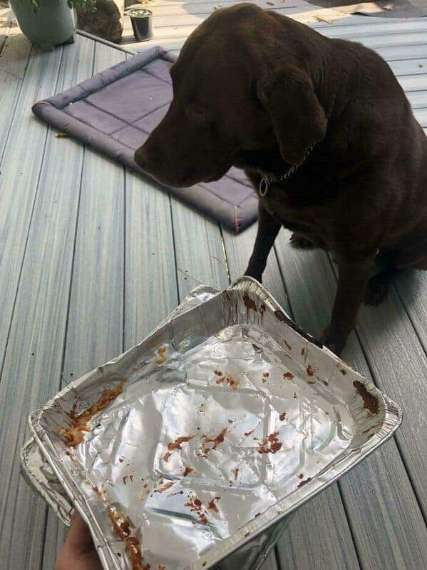 Guilty dog photos in the criminal mastermind category are the gallery’s most impressive specimens because they document not accidents but plans. The double-dinner fraud is the gallery’s most sophisticated entry, because it required the dog to identify a gap in parental communication, assess the opportunity correctly, and exploit it across what appears to have been multiple successful executions before the operation was discovered and documented. This is not a dog who made a mistake. This is a dog who identified a system vulnerability and returned to it. The cardboard sign behind which this dog sits does not contain remorse. It contains a status report.
