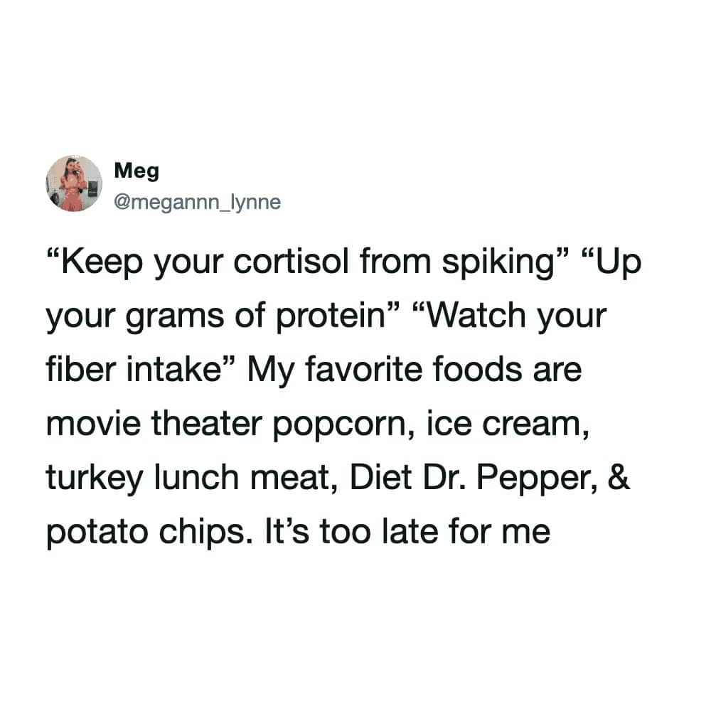 I am looking at that tweet about eating a high protein meal and then five billion cookies and I have never felt more seen in my entire life. The high protein meal is just the opening act for the main event: a mountain of dough. This is the reality of our fitness goals. We are out here trying to hit daily targets that feel like a full-time job. I am physically at capacity, but the app says I still need three more chickens to be a successful human. It is a level of fullness that makes me annoyed with my own existence. Then you have the wellness trends that are just getting out of hand. Protein ranch dressing? We have officially reached peak marketing. Next up is probably high-performance napkins for our sweat. We are all just macro manifesting at this point, hoping that if protein is meant for us, it will find us in a glass of prosecco and a piece of cheese. That is the only kind of meal prep I am actually willing to commit to. I especially love the proffee movement, which is really just a cry for help from people who hate the sound of their own jaw clicking. We see the capitalist gains of paying thirty dollars for a salad that has three cubes of lukewarm chicken added to it. It is a steal, but mostly for the restaurant.