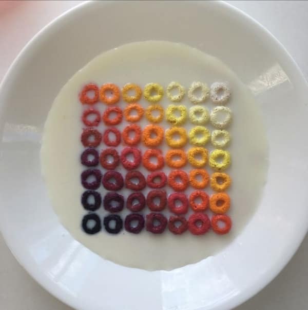 Satisfying photos compilation: A collage featuring Froot Loops sorted into a perfect color-gradient square in a bowl of milk, a vacuum head fitting exactly into a narrow corner, and recursive yellow van windows creating an infinity effect.