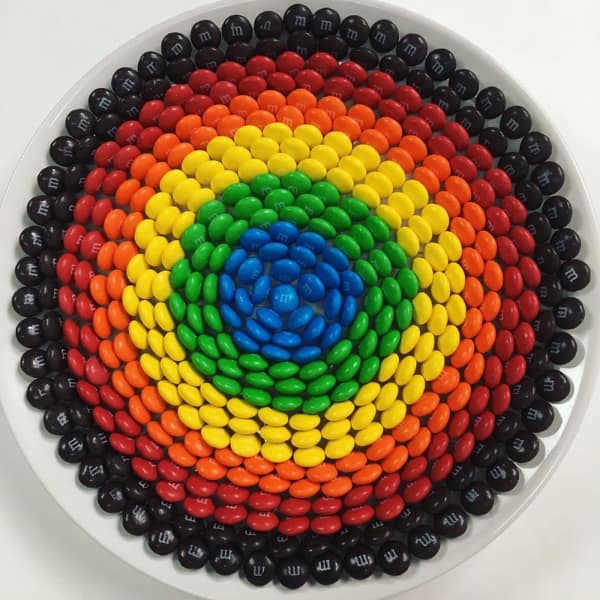 A clear Tic Tac container held in a hand, showcasing a satisfying photo of the mints meticulously sorted into five vibrant, monochromatic layers of purple, green, yellow, orange, and red.