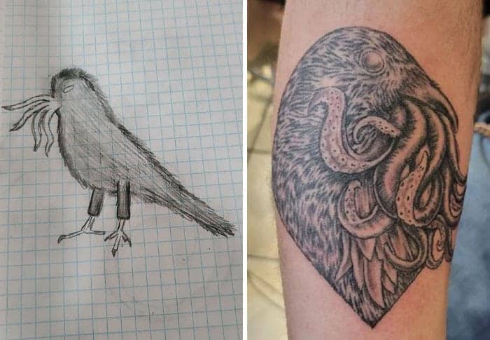 The sketch-to-tattoo transformation genre resonates the way it does because it makes the creative process visible in two steps rather than hiding it behind the finished product. Most art arrives as a completed thing, and the gap between the initial idea and the final work is invisible to the audience. Here, the gap is the content. The stick-figure otter exists alongside the finished chef otter, and the distance between them is both the joke and the tribute — the joke being that someone handed over a kindergarten drawing and asked for professional results, and the tribute being that the artist looked at that drawing and found something worth developing. The Furby reference labeled “wee tee” is either a profound test of an artist’s commitment or just someone being chaotic good, and the result suggests the artist was not deterred by either possibility.