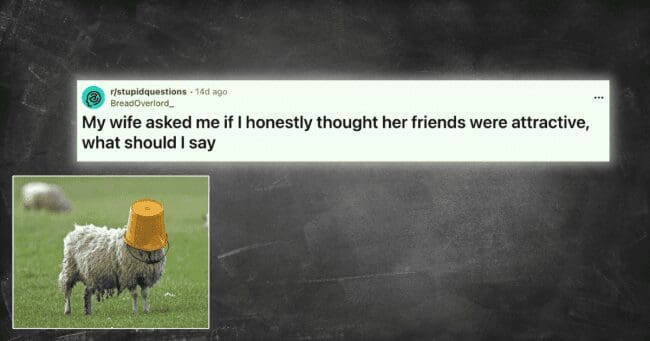 The husband asking Reddit what to say when his wife quizzes him on her friends’ attractiveness is the gallery’s only entry that functions as practical advice content, and the bucket-headed sheep is the correct illustrative image because it communicates the correct strategy, which is the one that provides no information that can be used against the answerer in any subsequent conversation. This is not cowardice. This is an accurate reading of the available options.