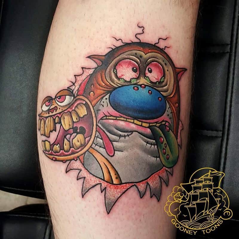 90s cartoon tattoos earn their gallery status through two parallel qualities that this collection documents in full: the emotional resonance of the source material and the technical skill required to translate that material into skin. These are not clipart transfers. They are fully realized works, built with the understanding that flat animation and traditional tattooing require different approaches to color, line weight, and shading, and that the difference between a cartoon tattoo that looks correct and one that simply looks like a cartoon on skin is the artist’s ability to navigate that translation. The Darkwing Duck and Gizmoduck sleeve is the gallery’s opening argument: two characters from a single afternoon block of television, rendered in full color with an action background that treats both characters as the main event simultaneously. Nobody stopped to ask if they should. They absolutely should have.