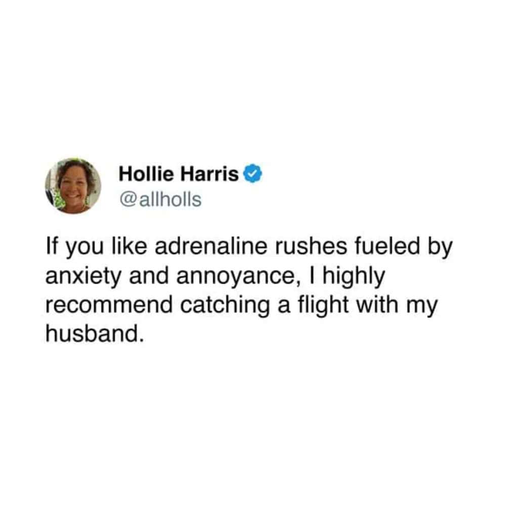 Funny marriage tweet from Hollie Harris comparing husband's snack hunger to jungle survival situations.