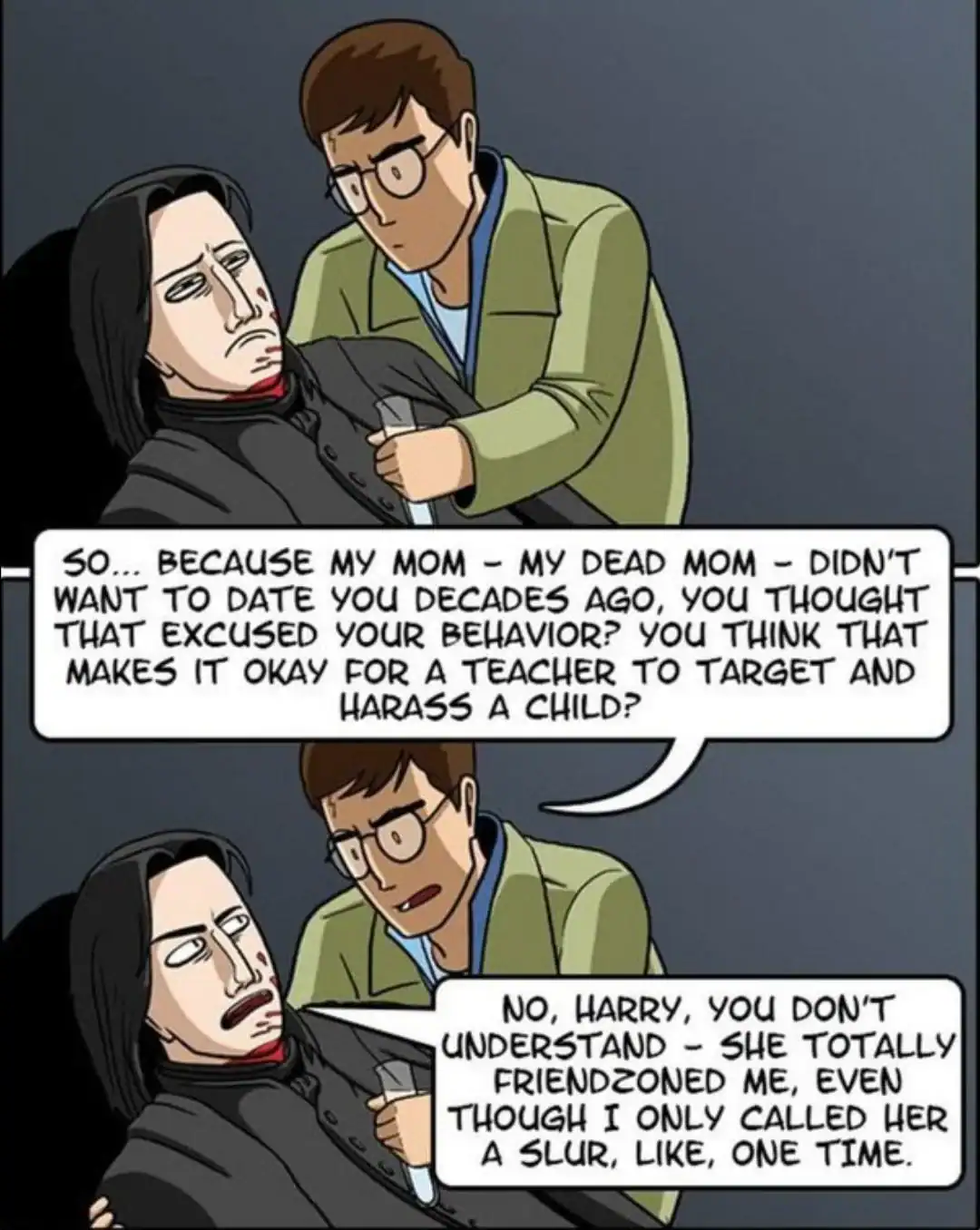 Four-panel Snape death scene meme reimagined as Joe Mama joke ending with Snape dying satisfied