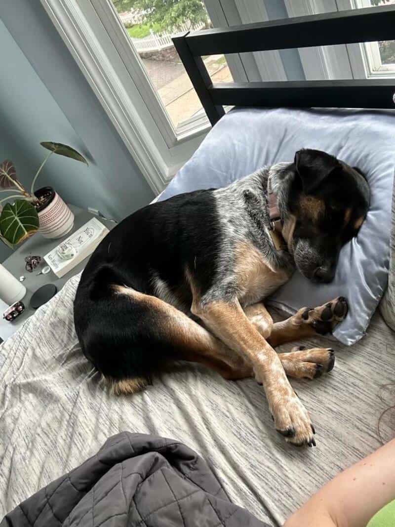 A speckled cattle dog mix lying in a grey plush bed. This funny dogs sleeping in weird positions entry shows the dog lying on its side while pulling its back legs forward in a dramatic, tucked-in crunch that would make an Olympic diver proud.