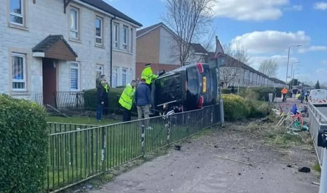 Heavily damaged car resting on its side inside yellow fast food restaurant drive-through at night with firefighter
