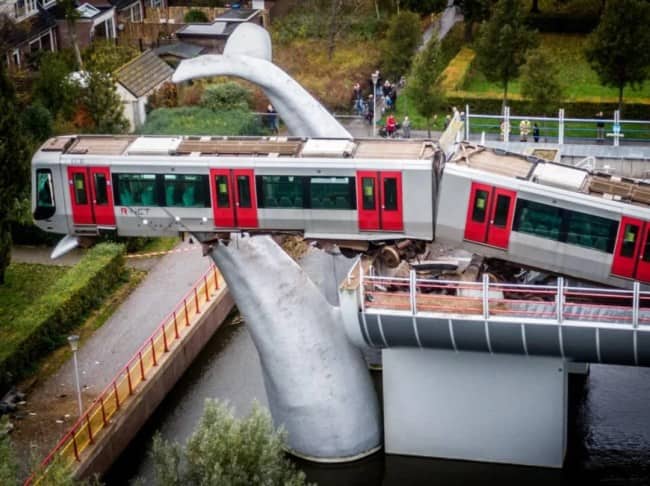 The whale tail is the gallery’s defining image because it represents a collision between infrastructure that was designed to be decorative and a situation that required it to be structural, and the whale tail rose to the occasion without being asked. The Dutch metro train departed its track at the end of an elevated line and was caught by a sculpture installed below it. Nobody designed the whale tail to be a train stop. The whale tail simply was there, at the right height, at the right moment, and the physics of the situation distributed its consequences accordingly. That is not luck. That is geometry. That is also the most elegant ending a metro malfunction has ever had, and the city of Spijkenisse should send the sculptor a note.