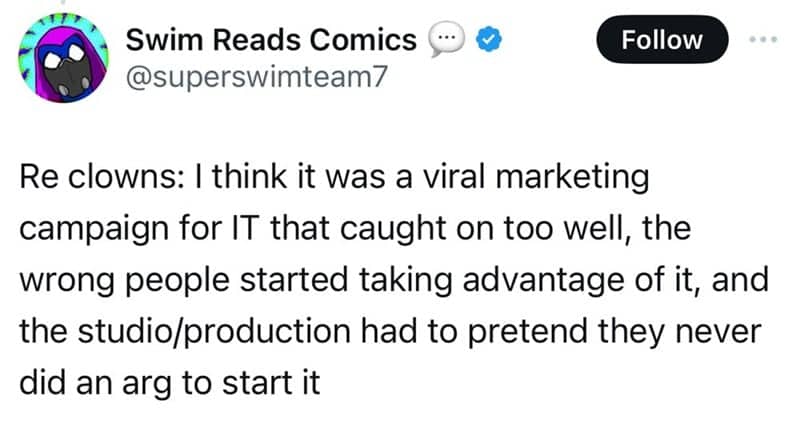 Screenshot of a tweet suspecting the 2016 clown panic was a social media experiment.