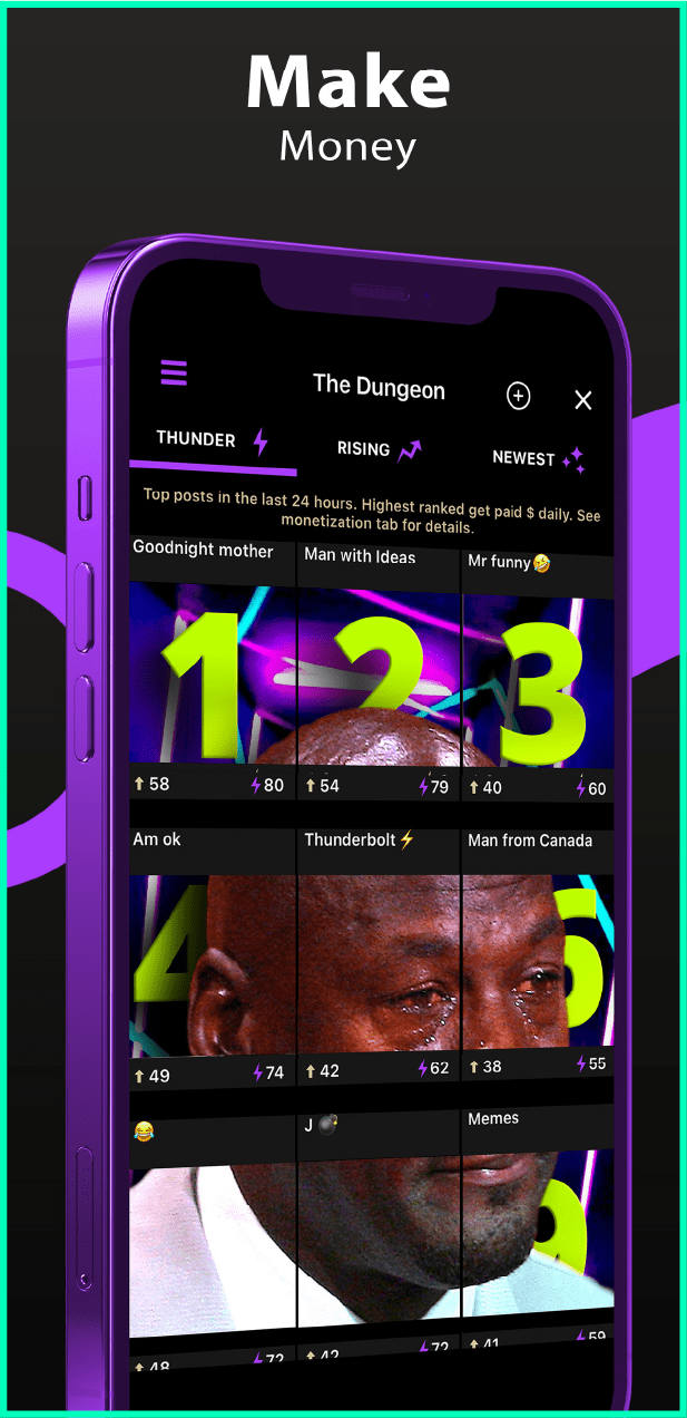 The Thunder App is the world’s first meme and image based monetization platform. With 500+ five star reviews on both IOS and Android app stores, we are the fastest growing meme app that actually pays its users (novel concept, we know.) Our 10,000+ (and growing) daily active users get paid to create memes, build a following or just be entertained by some of the funniest people from around the world. Hit the download button to join in and become part of the funnest community on the internet.